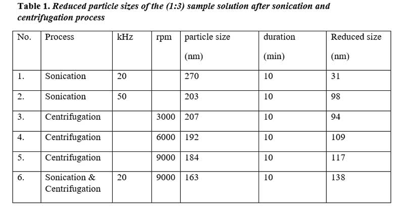 In this study, the 1:3 ratio sample was selected to investigate the effects of sonication and rotational speed on the nanoparticle size due to its good electrical conductivity and ink stability than other ratio samples. To assess the impact of sonication on nanoparticle size, 20 Hz sonication was applied after adding 3 g of ammonium solution to 1 g of silver acetate solution. Following this, 3 mL of formic acid was added, and the same reaction parameters were applied again. The final sample was then sent for characterization. The different reaction parameters were used as specified in Table 1, and the particle size of the samples treated under these parameters was characterized and compared.
