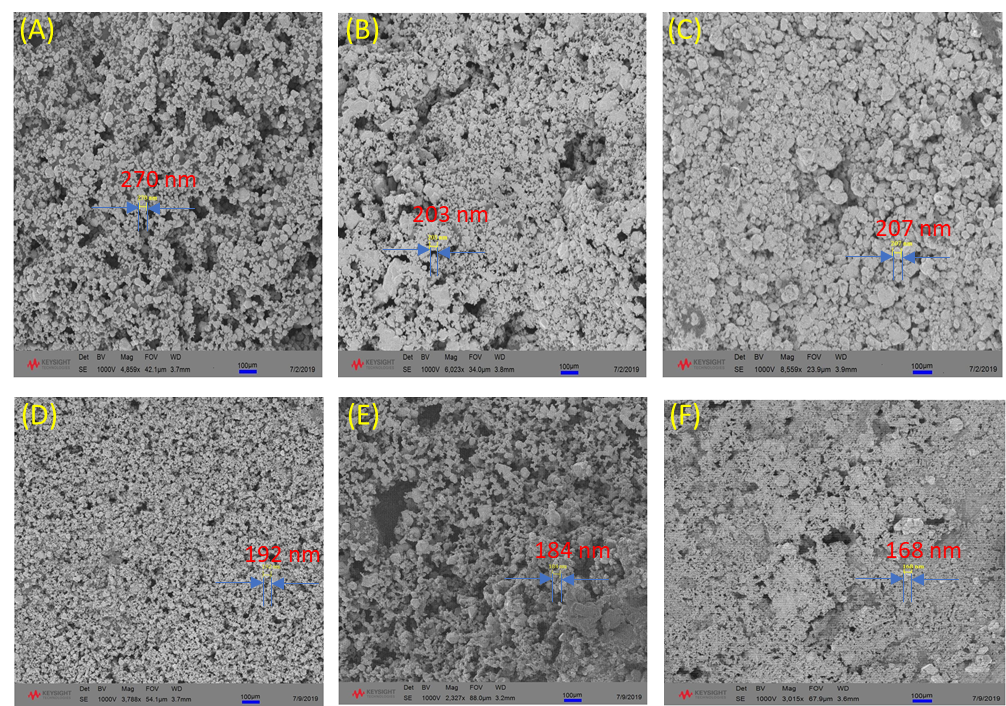 In this study, the effects of sonication and centrifugal force on particle size reduction were investigated to optimize the properties of the conductive ink. Table 1 summarizes the results obtained from these experiments. Specifically, 10 ml of silver conductive ink underwent sonication at frequencies of 20 kHz and 50 kHz for 10 minutes,150 W. The resulting particle sizes were measured at 270 nm and 203 nm, respectively (Figure 2A, B). Furthermore, centrifugation experiments were conducted on 10 ml of silver ink at different rotational speeds (3000 rpm, 6000 rpm, and 9000 rpm) for 10 minutes each. The particle sizes decreased to 207 nm, 192 nm, and 184 nm, respectively, as depicted in (Figure 2C, D, E). Additionally, combining ultrasonic homogenization at 20 Hz with centrifugation at 9000 rpm further reduced the particle size to 168 nm (Figure 2F). These findings demonstrate the significant efficacy of sonication and centrifugal force in refining the particle size distribution of the synthesized silver nanoparticles, thereby enhancing the electrical conductivity of the ink.
