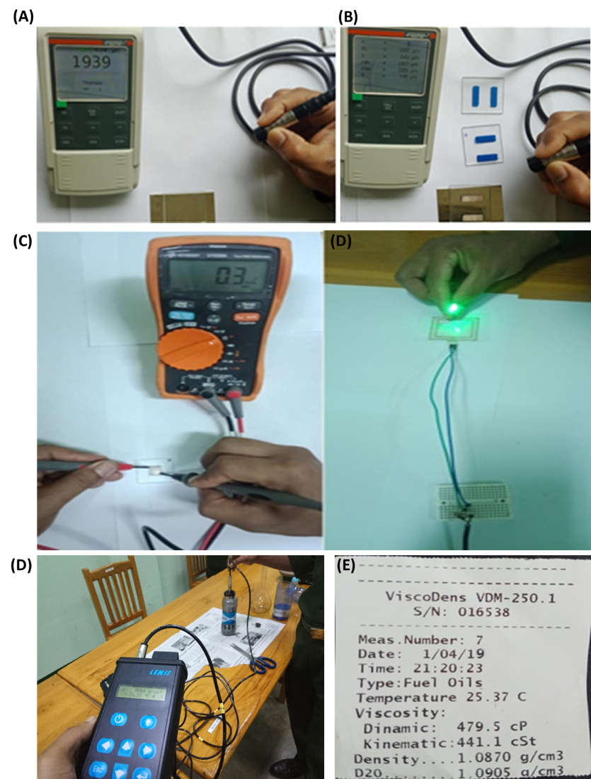 The viscosity measurements of silver-based inks were conducted using a Visco Dens VDM-250.1 viscosity testing meter (Serial Number: 016538). The testing was performed at a temperature of 25.37°C, with a corresponding density of 1.087 g/cm3. The viscosity of the silver ink was found to be 479.5 centipoise (cP) (equivalent to 479.5 mPas) (Figure 3E, F).