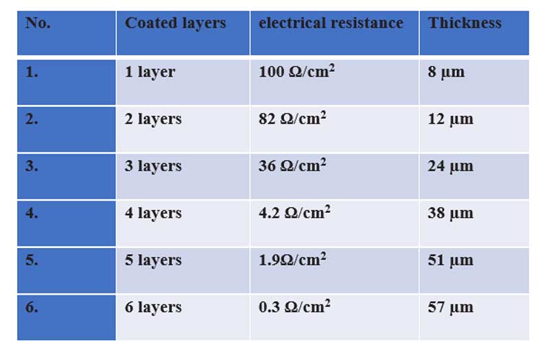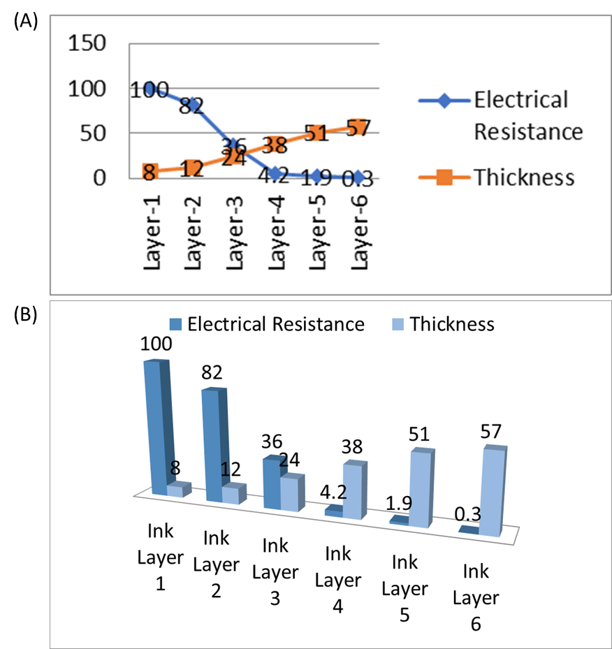 The resulting electrical resistance for different numbers of coating layers was presented in Table 2. Notably, as the number of ink layers and thus the thickness increased, the electrical resistance decreased, leading to improved conductivity of the coated ink. The correlation between thickness of net ink and its electrical resistance can be studied in Figure 4 A, B.
