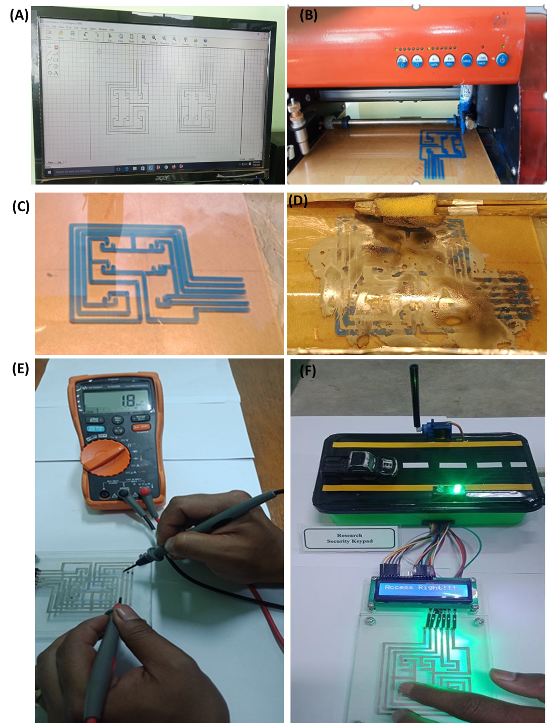 A security lock keypad board measuring (9×11 cm2) was designed using SolidWorks software, providing precise dimensions and layout for the circuitry. Subsequently, the circuit lines were drawn on the acrylic substrate using a Craft Cutting Plotter to get base-keypad lines. The keypad lines were 2 mm wide and had a thickness ranging from 5 to 6 µm. After drawing the keypad lines on the acrylic plate, conductive ink was applied to the keypad circuit lines and heated at 100°C using a 1000 W halogen light bulb until the ink coating was fully dried. Subsequently, the plate was then cooled at room temperature for 3 minutes. The six coating layers of ink were applied to the acrylic plate, and its electrical resistance and conductivity were measured using a digital multimeter device to achieve the desired electrical resistance and high electrical conductivity. The functionality of the security keypad system was verified using Arduino software, ensuring its compatibility with electronic systems.